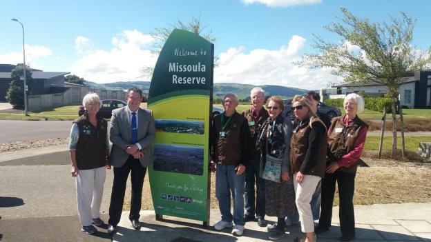 The Mayor and Friendship Force visitors from Missoula stand at the entrance to Missoula Reserve, named for our US Sister City.